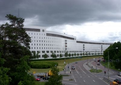 The building, constructed from 1989 to 1992 for Skandinaviska Enskilda Banken, emerged during Sweden's banking crisis and symbolized the 1980s construction period.