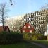 The Karolinska Institute auditorium features modern architectural design with large glass windows and spacious seating arrangements for medical lectures and presentations.
