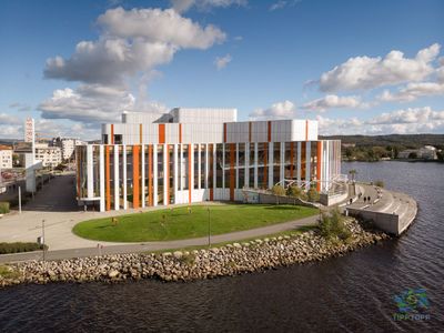 The building incorporates metal trumpet sculptures called Sunflowers by artist Milo Lavén, positioned along the waterfront exterior of the structure.