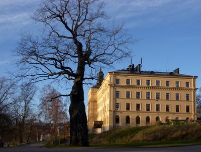 This ancient oak tree stands tall in Stockholm's Djurgården district, with its sturdy trunk and extended branches marking the landscape of the royal grounds.