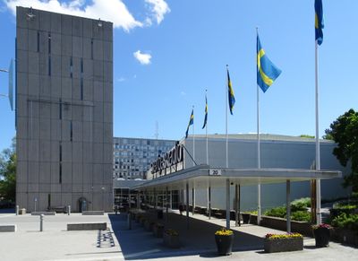 The building was deliberately placed next to other cultural institutions to create a hub for media and the arts. This arrangement makes the location a hidden gathering spot for those seeking to learn about Swedish media organizations.