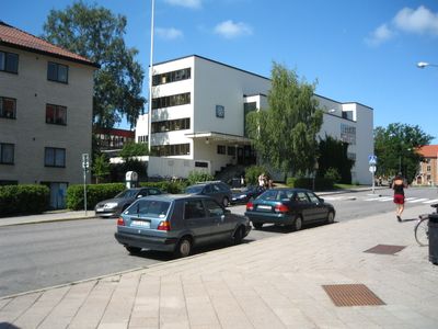 The Nymble building features straight geometric lines and extensive glass surfaces, representing the modernist architectural movement of the 1930s in Sweden.