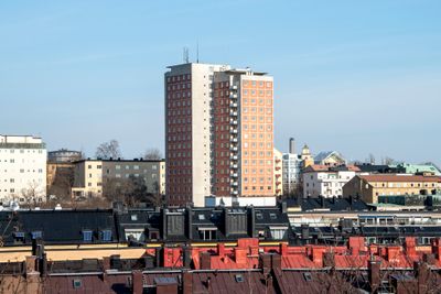 Several apartments between floors 8 and 10 feature balconies, offering residents elevated views of the Stockholm urban landscape.