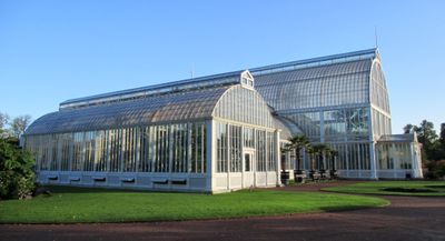 The Palm House features multiple climate-controlled sections housing tropical plants, desert flora, Mediterranean species, and a specialized orchid collection under a glass dome.