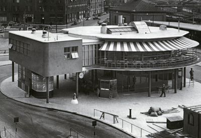 The Rotundan featured a distinctive circular design with a rectangular extension, supported by pillars that created a floating appearance at street level.