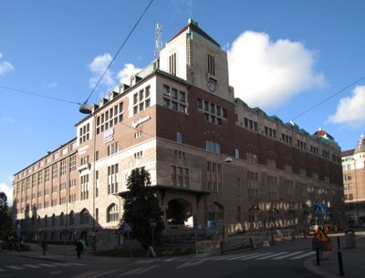 The Televerkets hus occupies an entire block with facades of red brick and granite, featuring copper revolving doors at its main entrance point.