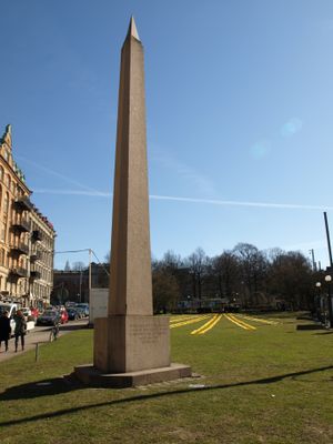 The Torgny Segerstedt Monument stands as a ten-meter high triangular monolith made of granite featuring inscribed quotes about freedom and resistance.