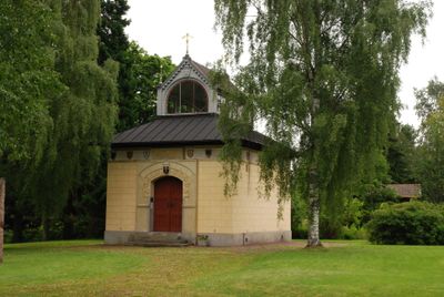 The Utmelandsmonumentet stands over a cellar entrance, constructed with granite and carved sandstone, featuring a glass lantern for natural light penetration.