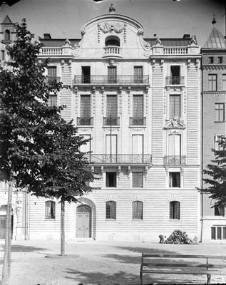 The building introduced Ekeberg marble as a facade material in Swedish architecture, incorporating a semicircular courtyard arcade with horse statues.