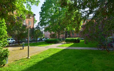 The former Pro Patria maternity clinic, designed by architect Carl Westman, operated near the park until 1980 before transforming into residential buildings.