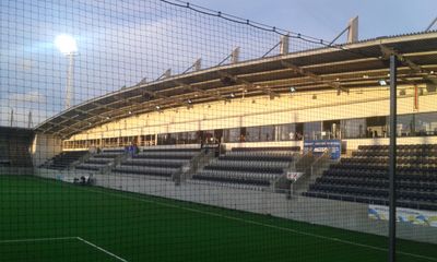 The stadium maintains a strict no-cash policy and features an artificial turf surface, accommodating 6,500 spectators across numerous designated seating sections.