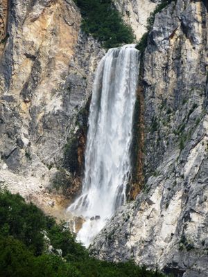 The Boka waterfall reaches a height of 144 meters and consists of two cascading drops flowing through limestone rock formations in the Julian Alps.