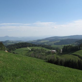 Pohorje is a mountain range in northern Slovenia covered with dense forests of metamorphic rock, spreading across a substantial area. The landscape rises to around 1,500 meters at its highest point and displays varied terrain between wooded slopes and open elevations.