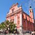 The Franciscan Church of the Annunciation is a baroque parish church at Prešeren Square featuring a distinctive salmon-pink facade with two bell towers. Its interior follows a basilica layout with a central nave and small side chapels.