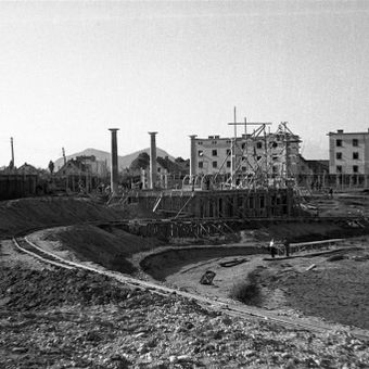 Bežigrad Stadium is a multi-purpose sporting venue in Ljubljana featuring tiered seating and balustrades enclosed by a brick wall with a large canopy supported by pseudo-Doric columns. The facility was designed to accommodate crowds and served as a key sports center for the city over many decades.