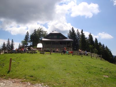 The site features both indoor seating for 12 people and outdoor accommodation for 50 visitors, with access through marked trails from Podljubelj.