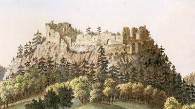 The castle grounds contain carved stone seats where, according to regional tales, Frederick and Veronika spent time together before their tragic separation.