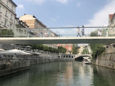 The footbridge links two central areas of Ljubljana, integrating with architect Jože Plečnik's vision for the city's riverside development and pedestrian connections.