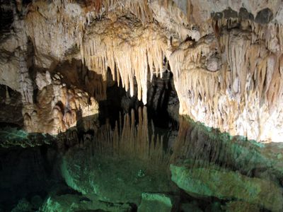 The cave system extends over 8,400 meters through underground passages, featuring large chambers with stalactites, stalagmites, and underground lakes.
