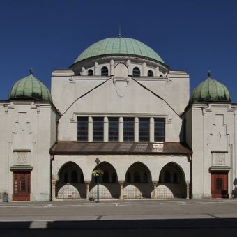 The synagogue features three prominent domes and incorporates Byzantine architectural elements with a reinforced concrete structure designed by Richard Scheibner and Hugo Pál.