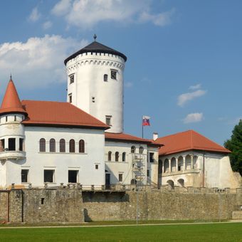 The four-story cylindrical tower of Budatín Castle stands at the meeting point of the Váh and Kysuca rivers, marking the entrance to Žilina.