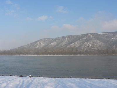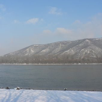 The Burda mountains stretch along the Danube River, forming natural borders with steep slopes and forested areas covering the landscape.