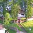 The wooden structure features traditional spruce construction with exterior wooden planks and an attached bell tower connected by a covered stairway.