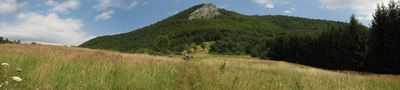 Temešská skala rises to 910 meters above sea level, featuring a massive dolomite limestone formation with sporadic tree coverage on its slopes.