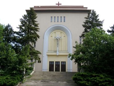 The Kostol Panny Márie Snežnej is a church in the Old Town of Bratislava that blends Gothic and Renaissance architectural styles. The interior features soaring vaulted ceilings, an ornate altar, and religious sculptures accumulated across different periods of renovation.