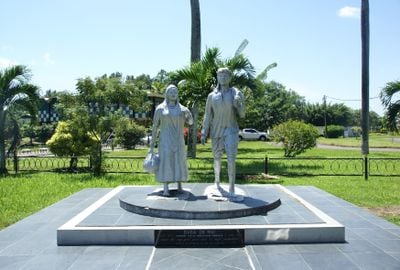 The Baba and Mai statue features two figures, a father and mother, representing Hindustani immigrants who settled in Suriname during colonization periods.