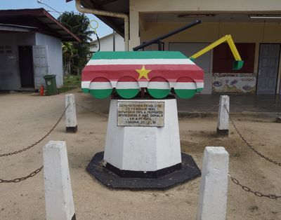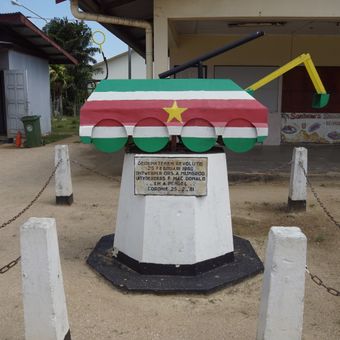 The Gedenkteken Revolutie stands near Tata Colin Square in Totness, serving as a central memorial structure in the administrative center of Coronie district.