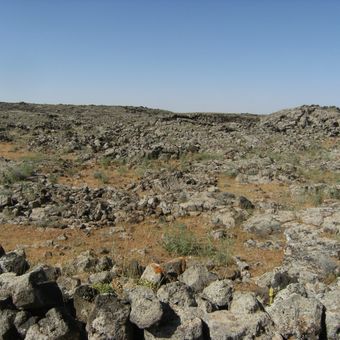 Lajat is a lava field in southern Syria covered by gray volcanic rock with scattered shallow depressions suitable for farming. The terrain sits at roughly 700 meters elevation and displays uneven surfaces characteristic of ancient lava flows.