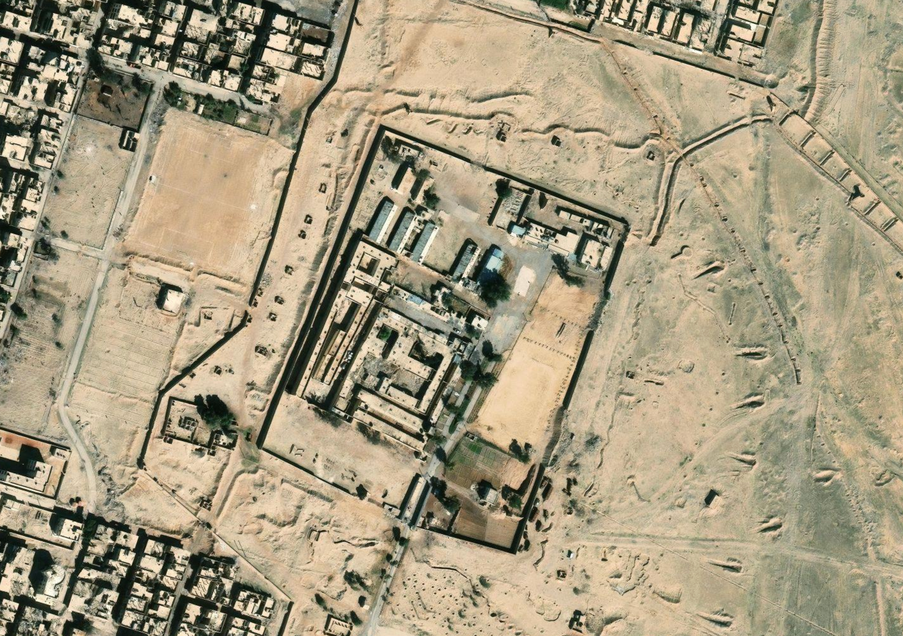 The prison was closed in 2001, reopened during the 2011 uprising to detain protesters, and ultimately destroyed by Islamic State militants in 2015 after they captured Palmyra, ending its operational history as a detention center.