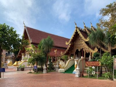 The temple grounds contain multiple buildings with traditional Lanna architectural elements, featuring intricate wooden carvings and detailed golden decorations throughout the structures.