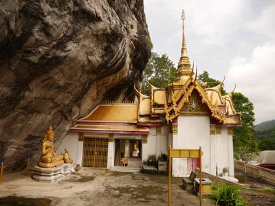 The temple contains multiple buildings along a hillside, featuring a large reclining Buddha statue and several smaller shrines throughout the complex.