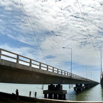 The Tinsulanonda Bridge extends across the water with a total length that connects mainland Songkhla with the Ko Yo island in southern Thailand.