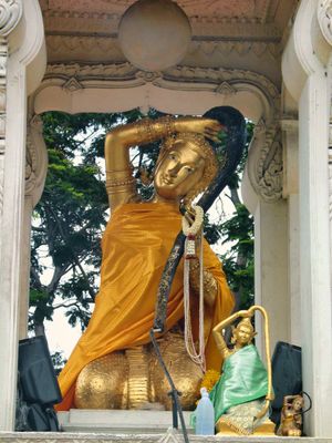 The shrine walls display intricate murals that illustrate the story of Mae Thorani wringing water from her hair to defeat Mara's army.