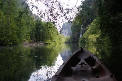 Visitors can kayak through the connected cave systems of Tham Lod Nua and Tham Lod Tai, exploring natural formations within limestone structures.