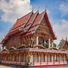The central structure displays gold and red ornamentation on its exterior walls, while the interior contains murals depicting scenes from the life of Buddha, created by Thai artisans using traditional techniques that have been passed down through generations of temple painters.