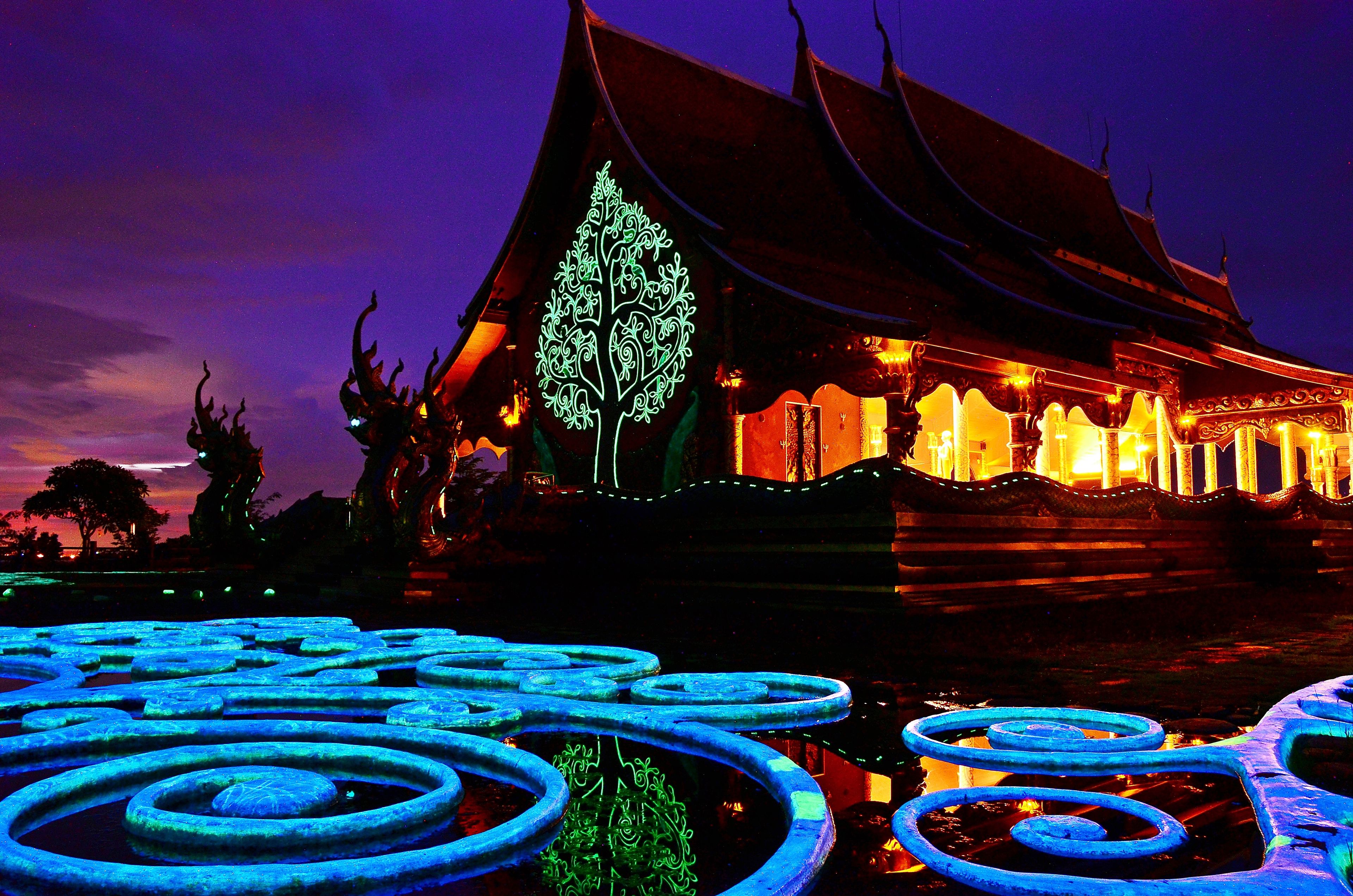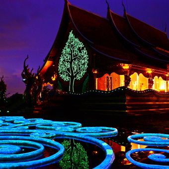 The temple walls contain phosphorescent paintings that absorb sunlight during the day and emit a bright green glow after sunset.
