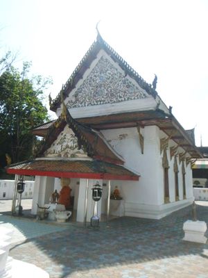 The temple complex contains a wooden Sala, several shrines, and an old Ubosot with gables adorned with Chinese porcelain and detailed wood carvings.