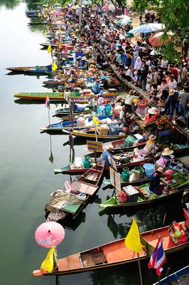 Local vendors wear traditional Thai clothing while selling a mix of Buddhist Thai and Muslim dishes from their boats in the waterway.