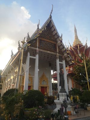 The temple features traditional Thai architectural elements, including ornate roofs, decorated pillars, and multiple prayer halls arranged within its spacious grounds.