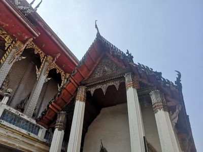 The temple complex is accessible via boat tours departing from Taling Chan floating market or by motorcycle through Soi Wat Thong Bang Chueak Nang.