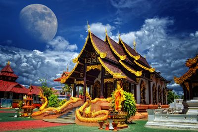 The temple features traditional Thai architectural elements with ornate carvings, detailed murals, and multiple Buddha statues throughout its spacious grounds.