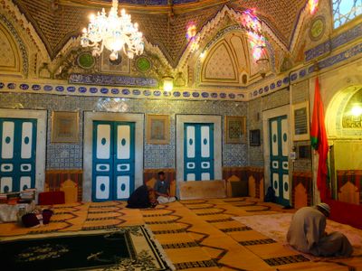 The mausoleum features a central courtyard with visitor rooms, leading to an oratory covered by a decorated dome and housing sacred tombs.