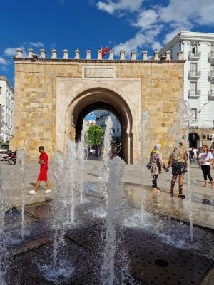The gate incorporates elements of North African and Mediterranean architectural styles, reflecting the multicultural influences that shaped Tunisia's urban development.