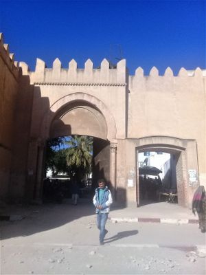 The Bab El Kasbah features two entrances with stone columns and leads to a square bordered by traditional religious structures and gardens.