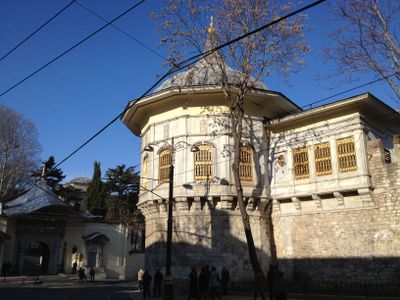 The building dates to Ottoman times, when it served as a Procession Kiosk where sultans greeted janissary troops. After 1928 it became a gathering place for Turkish language associations before later becoming a museum dedicated to author Ahmet Hamdi Tanpinar.