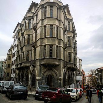 The Erzurumlu Nafiz Bey Apartment displays gray exterior walls and stands at the intersection of Işıklar Avenue and Alataş Street in Ankara.
